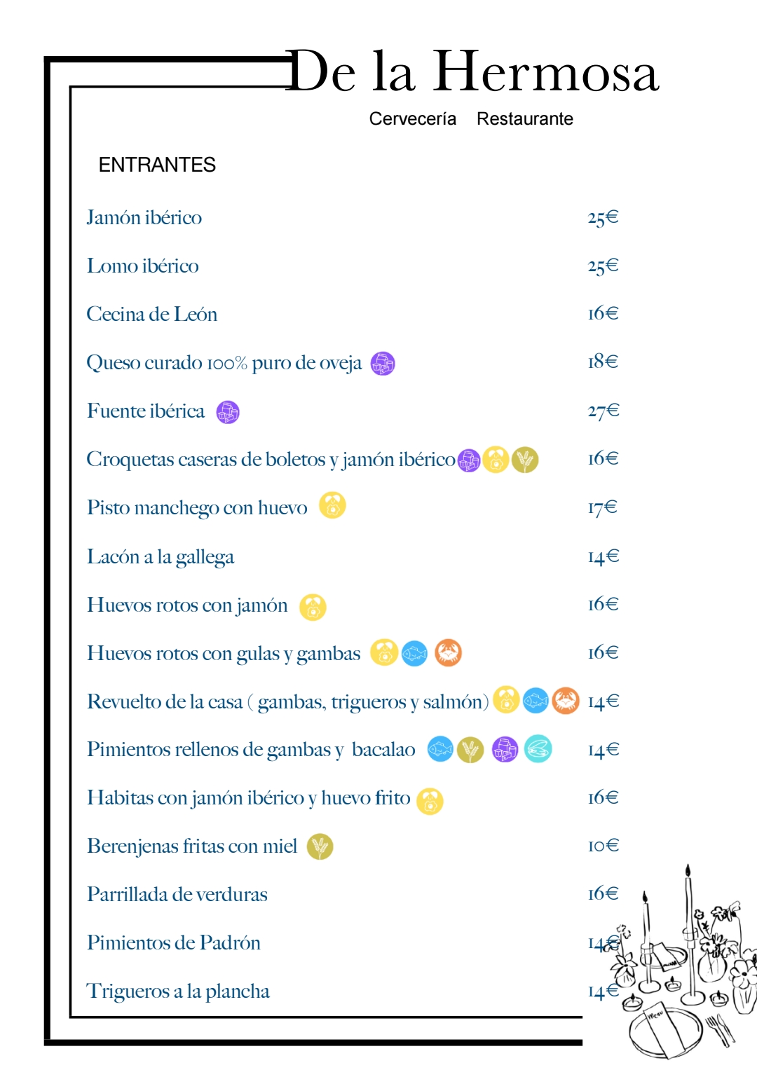 En el Restaurante Cervecería de la Hermosa, te invitamos a explorar nuestra exquisita carta, que refleja nuestra pasión por la gastronomía. Cada plato ha sido cuidadosamente elaborado con ingredientes frescos y de alta calidad, garantizando una experiencia culinaria que deleitará todos tus sentidos. Desde nuestras tapas tradicionales hasta nuestros platos más innovadores, cada bocado cuenta una historia y rinde homenaje a la rica cultura gastronómica de España. ¡Bienvenidos a un festín de sabores en el corazón de Madrid!