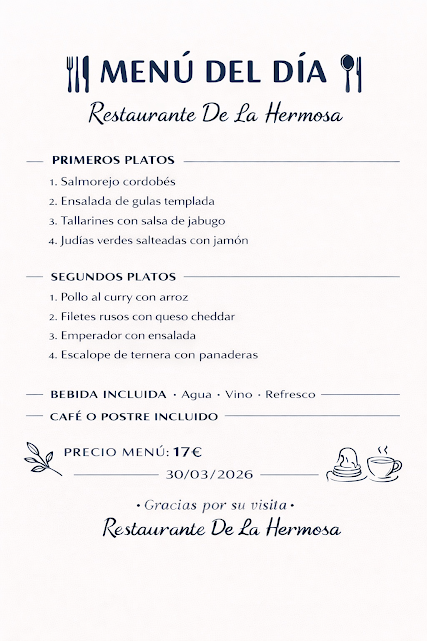 Nuestro menú combina recetas tradicionales con toques actuales, ofreciendo variedad cada día para que siempre encuentres una opción que te apetezca. Una propuesta diseñada para quienes buscan calidad, buen precio y el placer de comer bien en un ambiente acogedor.